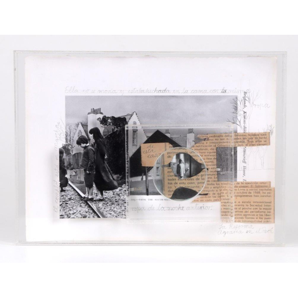 SILVANA PESTANA E SONIA CUNLIFFE – “Small Country Houses”, do projeto Desarraigo – 2012. Fotografia e colagem em estrutura de acrílico com lente de aumento, criação das artistas peruanas Silvana Pestana e Sonia Cunliffe, integrantes do projeto Desarraigo, que aborda temas de memória, deslocamento e identidade latino-americana. Nesta obra, as artistas exploram a sobreposição entre imagem e objeto, utilizando o acrílico e a lente como elementos de mediação entre o real e o simbólico, convidando o observador a uma leitura íntima e fragmentada da memória. A peça foi adquirida na Feira de Arte ArtBO (Bogotá, Colômbia) em 2012, pela Galeria Panamá, e integra uma série reconhecida por seu olhar poético e crítico sobre o território e o pertencimento. Dimensões: Altura 22 cm × Largura 30 cm × Profundidade 5 cm