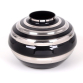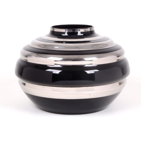 RUPPEL/ BOOM - Imponente vaso do período Art Déco, executado em vidro opalino preto decorado com faixas prateadas aplicadas horizontalmente. A peça, de grande presença e refinamento formal, é atribuída ao fabricante belga Ruppel/Boom, conhecido pela excelência técnica e pelas composições geométricas características do estilo. Assinatura do designer na base. Dimensões: Altura 24 cm × Largura 33 cm