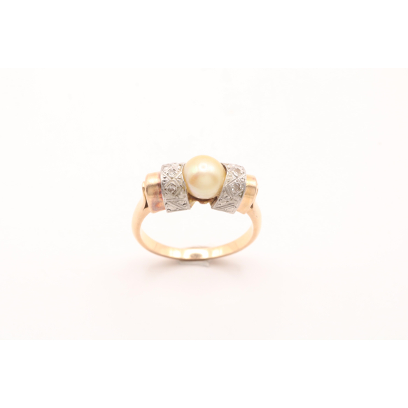 Anel antigo de ouro avermelhado 18k, platina, diamantes lapidação 8x8 e uma pérola cultivada de 7mm. Peso total: 6,4g. Peso aprox. de diamantes: 0,10ct 8x8. Medida 20.