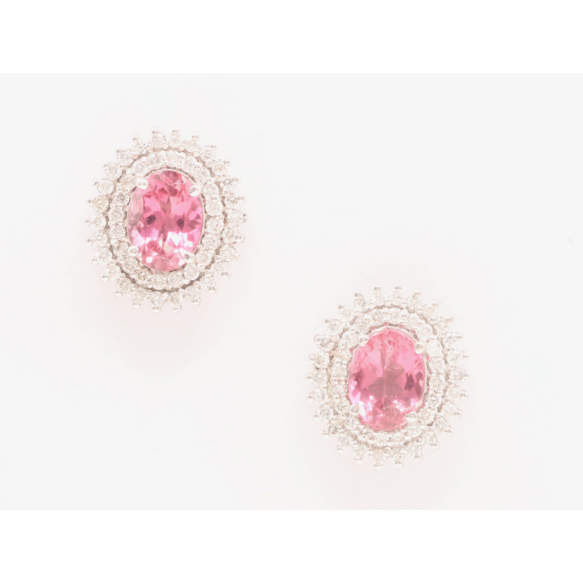 Par de brincos de ouro branco 18k com diamantes de aproximadamente 1.10cts e turmalina rosa central de aproximadamente 2.55cts no total. Comprimento: 1,3cm. Peso total: 6,2g.
