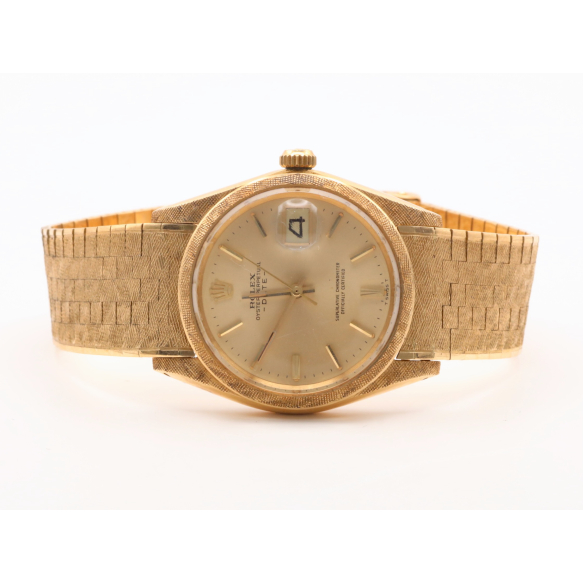 Rolex Oyster Perpetual Date "Barck" circa 1966 - Caixa e pulseira de ouro rosa 18k. Cerca de 35mm de diâmetro. Movimento automático com data. Visor de acrílico. Caixa, coroa, movimento, mostrador e fecho assinados. Ref.1502/nº1301245. Obs.: Para pulsos de até 20cm. Funcionando regularmente no momento da descrição. Sem garantias futuras.