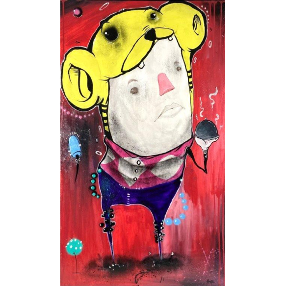 ANDY HOPE – Composição com figura. OST, 120 x 70 cm. Artista da Cidade Tiradentes (SP), Andy Hope tem sua obra marcada pela influência da street art e dos cartoons.