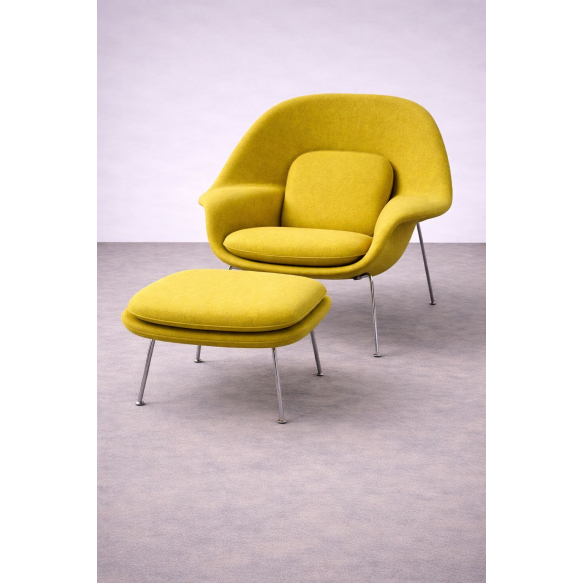 EERO SAARINEN - Poltrona e Banqueta Womb Chair Amarela – Década de 60 - Espuma injetável. Poltrona: Largura 102cm | Profundidade 82cm | Altura 90cm | Altura do assento 40cm. Banqueta: Largura 65cm | Profundidade 51cm | Altura 42cm . Modelo criado por Eero Saarinen em 1947, foi desenvolvido para sua amiga designer Florence Knoll, com objetivo de satisfazer sua proposta, uma cadeira reconfortante, que trouxesse um ar de aconchego materno. A tradução bruta de seu nome (womb chair), significa ventre materno. Esta poltrona, inovou e trouxe muito conforto para os lares norte americanos nos anos 40. É uma ótima escolha de um clássico, que pode ser utilizado em qualquer local, trazendo um ar de contemporaneidade.
