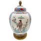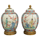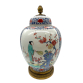 Raro par de cachepots em porcelana com decoração policromada, dita Kakiemon. Bases e tampas ornadas em bronze ormolu cinzelados. Japão, período Edo, final do século XVII.28 cm. Apresenta selo do antiquário na tampa.