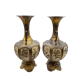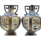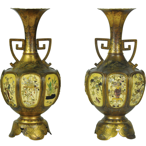 Par de vasos com suas alças executados em bronze ricamente cinzelado com elementos florais e casarios, placas de marfim e madrepérolas no estilo conhecido como Shibayama. Assinado no verso. Japão, período Edo, meados do século XIX. 32 cm.