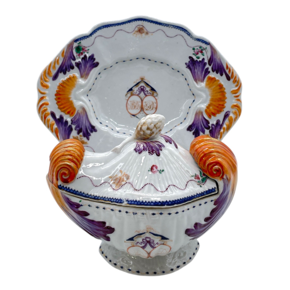 Rara pétit terrine com seu presentoir em porcelana policromada Cia das Índias, com formato concha e rocalilles, decoração Família Rosa. China, Qing, Qianlong (1736-1795). Apresenta restauro no bojo. Molheira 13 x 16 x 12 cm e Travessa 18 x 23 cm.