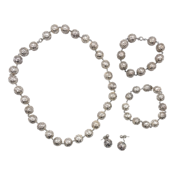 Joia de crioula. Conjunto de colar, 2 pulseiras e par de brincos, em prata de lei cinzelada, no formato de bolas confeitadas. Brasil, século XIX. Medida do colar aberto: 60 cm.