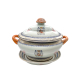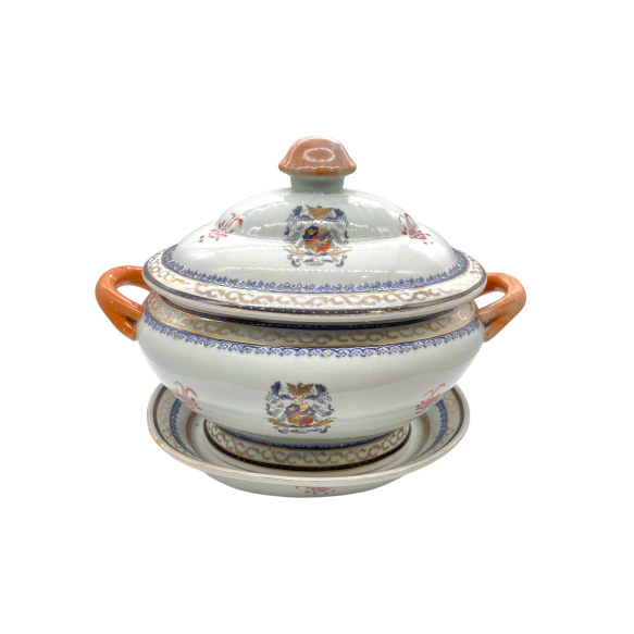 Sopeira e seu presentoir em porcelana, decorada manualmente ao estilo da Companhia das Índias. China. 30 x 39 x 25 cm (sopeira) e 25 x 30 cm (presentoir).
