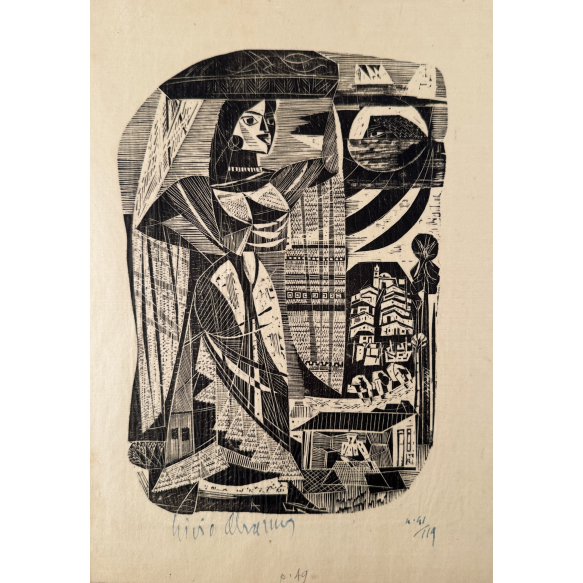 LÍVIO ABRAMO - Xilogravura, em papel japonês, editada em 1946 pela Sociedade dos Cem Bibliófilos do Brasil para o livro "Pelo Sertão", de Afonso Arinos. Ed.41/110. MI: 24 x 16,7cm. ME: 30,5 x 23cm. Com moldura e passe-partout: 44,5 x 33cm. Ass. inf. esq.