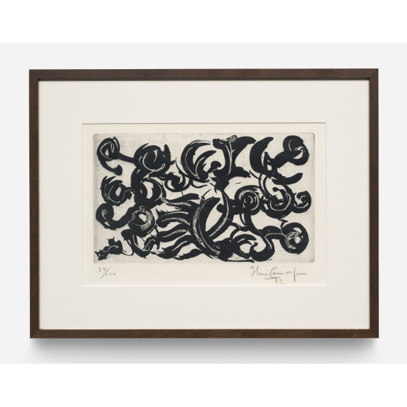 IBERÊ CAMARGO - Gravura em metal. 'Composição Abstrata'. Ed.34/110. 1963. MI: 20 x 34,5cm. Com moldura e passe-partout: 41,5 x 54,5cm. Ass. inf. dir. Reproduzida no Catálogo Reisonné do artista sob o cód. CR-107/G-103 em paginação dupla - pgs. 2238-2239.