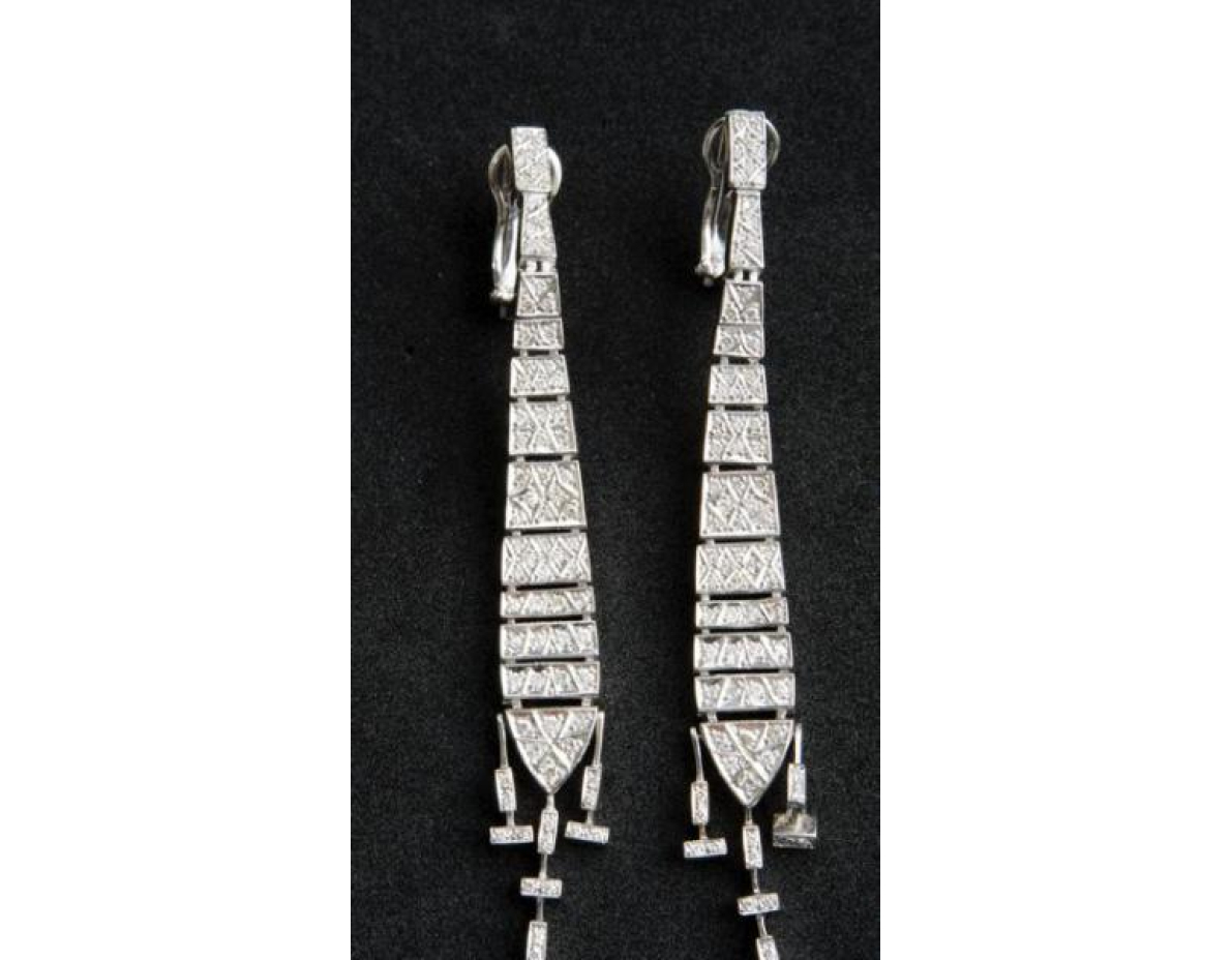 GRANDE PAR DE BRINCOS LONGOS EM OURO BRANCO 18K CONTRASTADO COM 146 BRILHANTES FULL CUT DE APROX 3 QUILATES TOTAL.