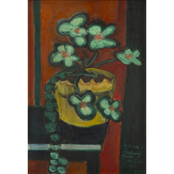 Nello Nuno - Vaso de flores - Óleo sobre Duratex - 36 x 26 - 1963 - Ass. Canto inferior direito - Com cachet da retrospectiva -FUNARTE - Palácio das Artes - Fundação Clóvis Salgado Dezembro de 1980. Com dedicatória a Vilma e Frederico.