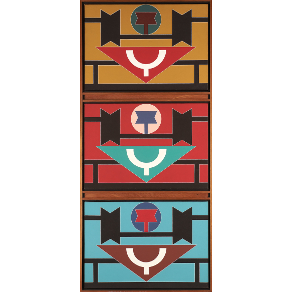 Rubem Valentim - Tríptico – Variação I - Variação II - Variação III - Acrílica sobre tela - 35 x 50 cada totalizando 105 x 50 - Brasília - DF - 1987 - Assinados e com monogramas no verso - Coleção Ronaldo Copolillo – Origem Galeria Celso Albano - DF