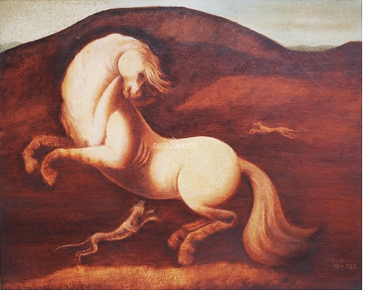 ORLANDO TERUZ "Cavalo e Cachorros" Oleo Sobre Tela -Med: 60 x 74 cm (Obra) 91x105 cm (Mold) -Assinado e Dat 1982 no CID - Com Cachet/Etiqueta Galeria Contorno no verso, numerado, datado e assinado.