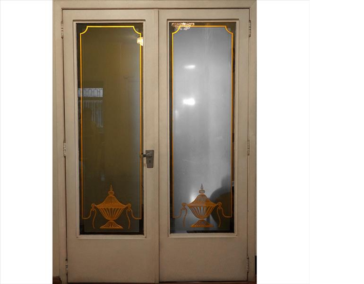 Jogo de duas portas de ferro patinado, placas de vidro acidadas e com detalhes dourados.