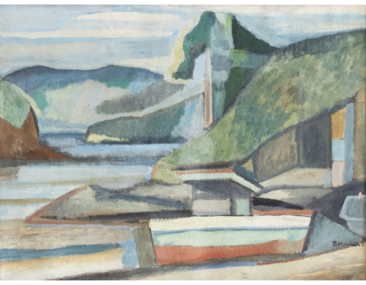Fúlvio Pennacchi - Festa Junina - OSP - 40 x 60 cm - Acid, 1989 Essa obra traz a característica narrativa e afetiva de Pennacchi, com uma cena popular retratada em um vilarejo litorâneo, marcada por cores terrosas e tons suaves.