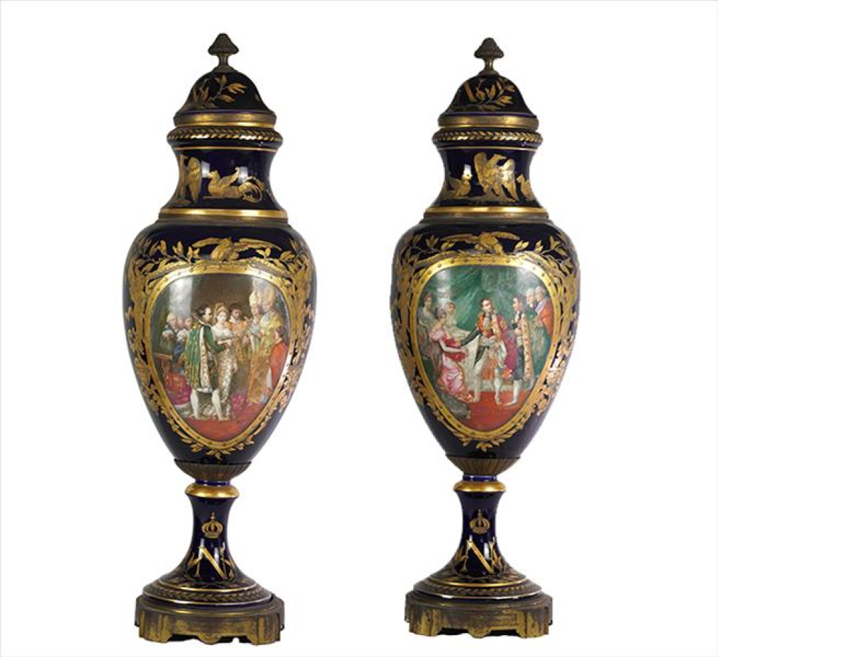 Par de monumentais ânforas de porcelana esmaltada, ornamentadas com cenas de Napoleão, sendo uma o pedido de casamento de Napoleão à Maria Luísa da Áustria em 1810, e a segunda, o casamento oficial no mesmo ano, verso com representação do Chateau de Compiegne.