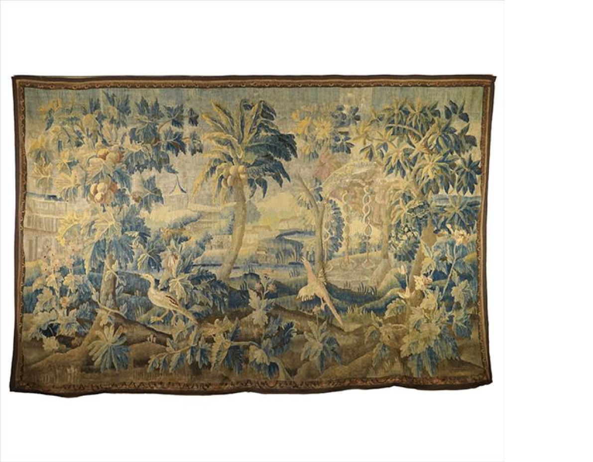 Tapeçaria Aubusson com temática verdure, ricamente ornamentada com pássaros, coqueiros e casario.