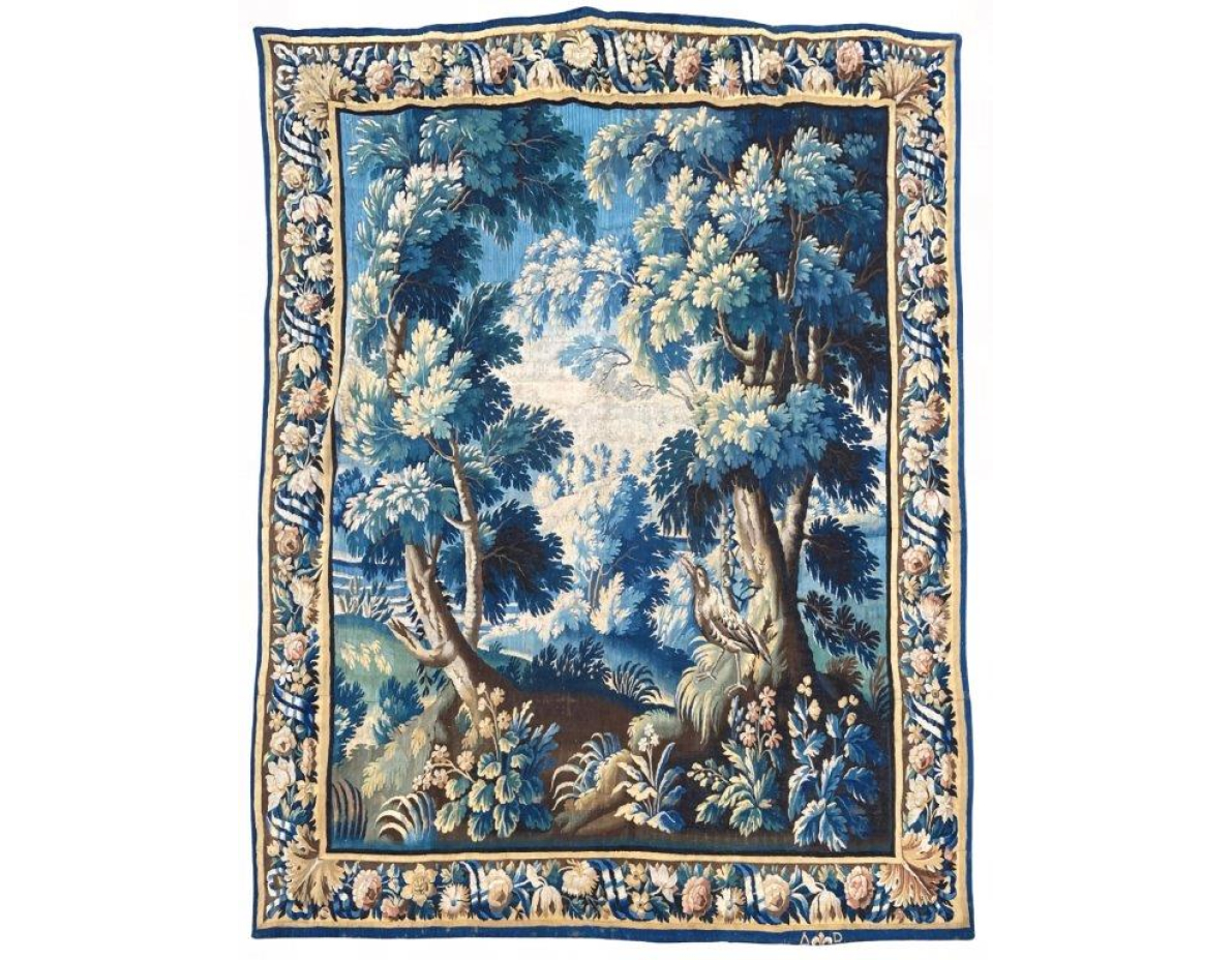 AUBUSSON - Belíssima tapeçaria representando paisagem, assinada na borda A-B acompanhada da flor de lis.