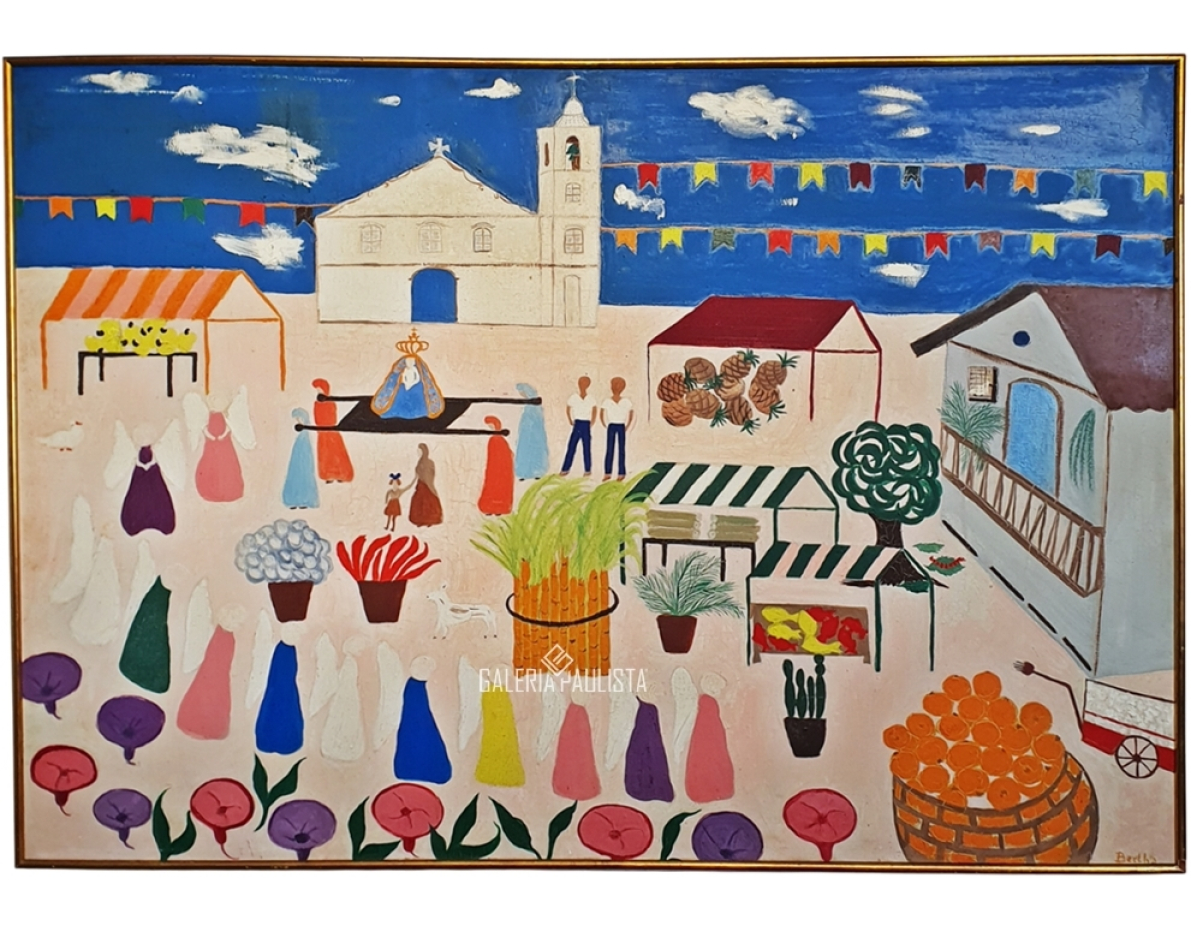 BERTHA de Moraes Novaes "Festa da Padroeira" Oleo Sobre Tela -Med 128 x 88 cm -Assinada no CID -Dec 70 -Com moldura.